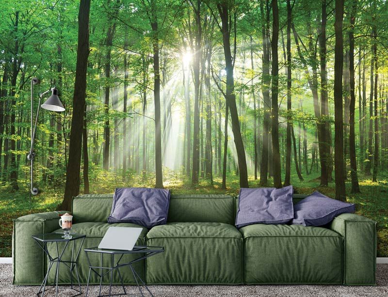 Vlies fotobehang van de zonsopgang in het groene bos.