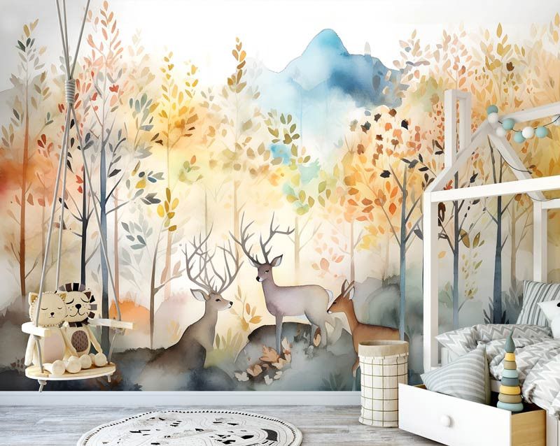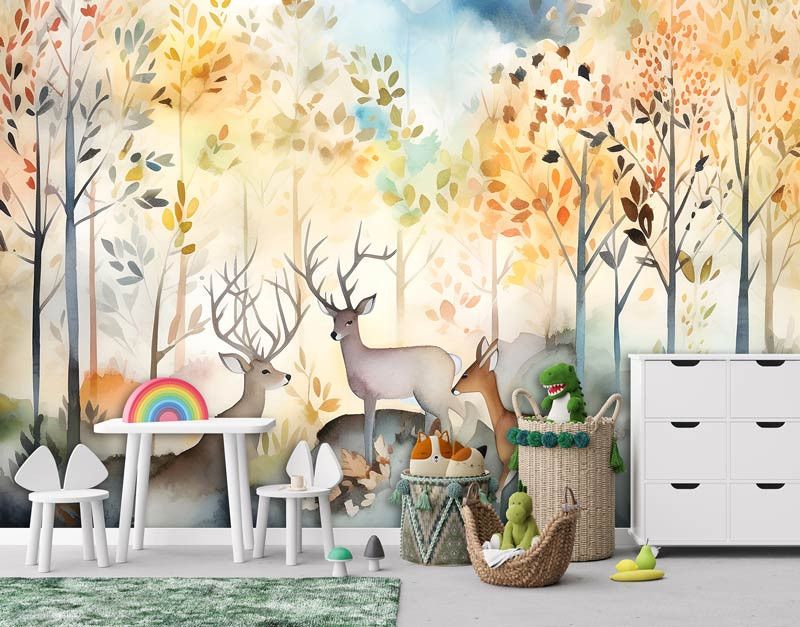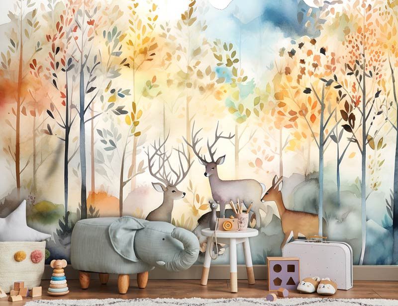 Haal de natuurlijke charme van het bos naar binnen met ons Fotobehang Bosdieren Aquarel. Laat je inspireren door de prachtige aquarelafbeeldingen van bosdieren en creëer een sfeer van rust en sereniteit in elke kamer, perfect voor de kinderkamer.