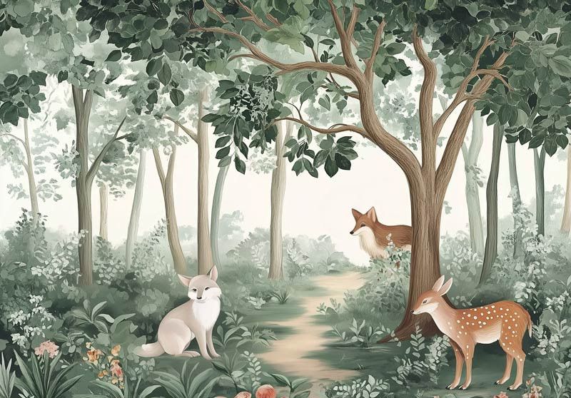 Creëer een magische sfeer in de kinderkamer met dit lieve fotobehang. Het ontwerp toont een rustig bos vol schattige dieren, zoals vosjes en een hertje, die tussen de bomen en planten staan. De zachte groene tinten en subtiele details zorgen voor een sprookjesachtige, dromerige uitstraling die perfect is voor een knusse kinderkamer.
