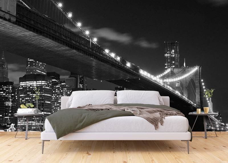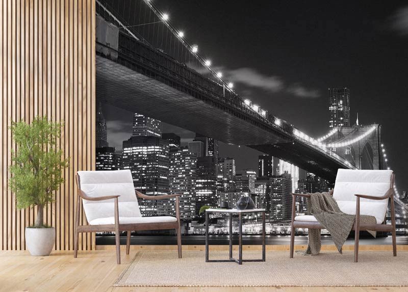 Geniet van het iconische uitzicht op de Brooklyn Bridge bij nacht. Dit fotobehang vangt de sfeer van New York's stadslichten en de majestueuze brug perfect. Een unieke aanvulling voor woonkamers of kantoren.
