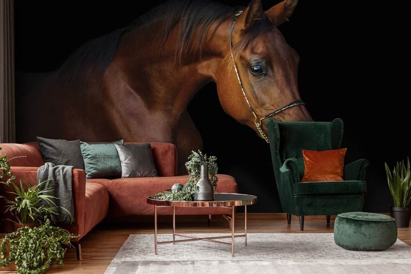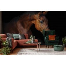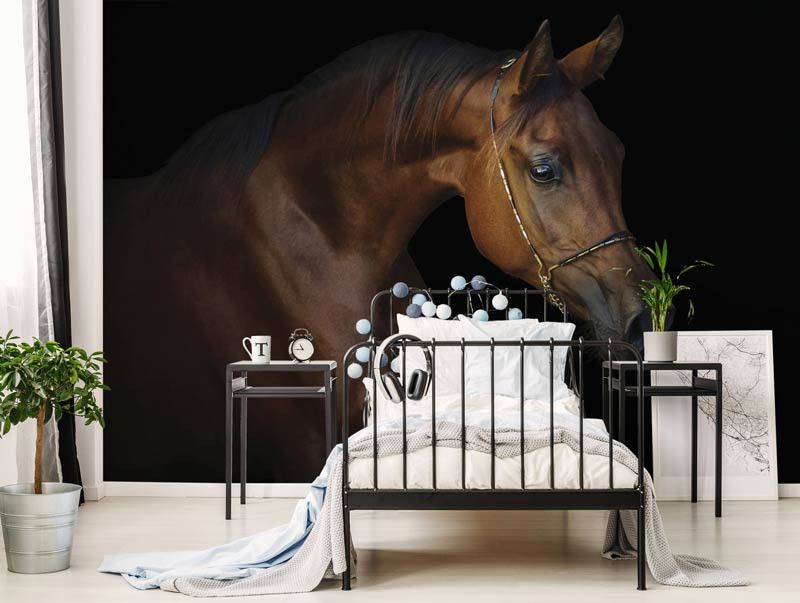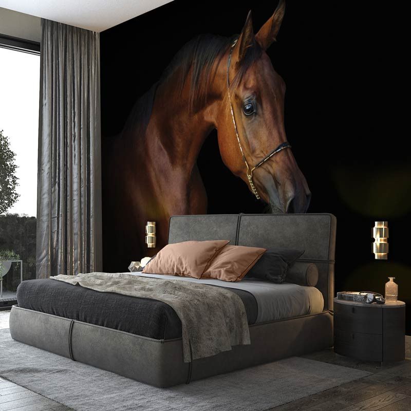 Met ons fotobehang op maat kun je elke ruimte omtoveren tot een prachtige kamer. De krachtige uitstraling en duurzame materialen zorgen voor een langdurige en indrukwekkende muurdecoratie. Laat je meevoeren naar de mysterieuze pracht van een bruin paard op een zwarte achtergrond met dit fascinerende fotobehang.