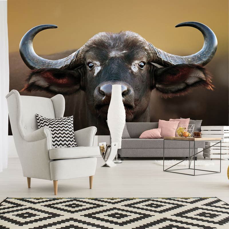 Het fotobehang van de buffel is echte eyecatcher in de: woonkamer, slaapkamer, hobbykamer, keuken, hal, kantoor of iedere andere ruimte.