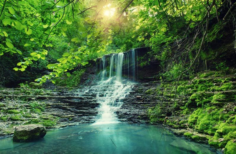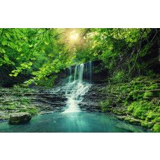 Stap binnen in een betoverend landschap met Fotobehang Cascade Waterfall. Ervaar de majestueuze schoonheid van een waterval die zich als een cascade naar beneden stort, omgeven door weelderig groen en imposante rotsformaties. Het geheel vormt een adembenemend schouwspel dat de kracht en pracht van de natuur perfect belichaamt.