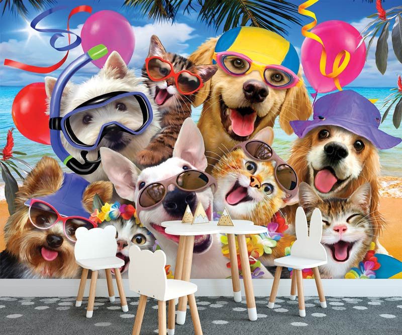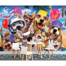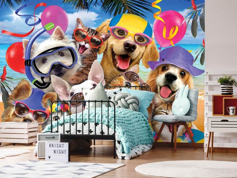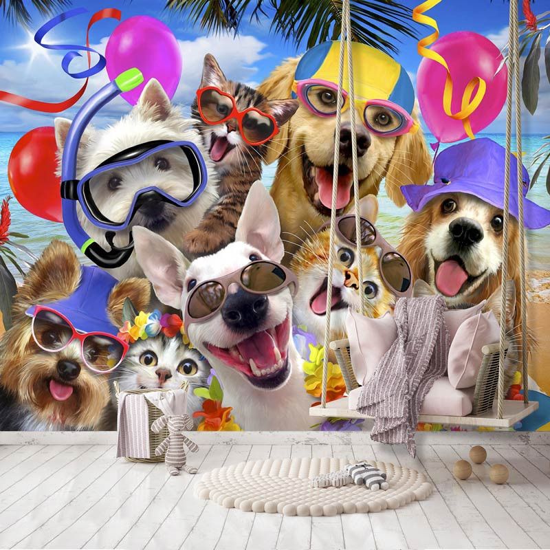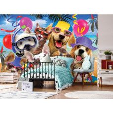 Vlies fotobehang van doldwaze katten en honden die speciaal voor jouw kind de feestkleding hebben aangetrokken en een te gekke foto hebben gemaakt! Een must voor elke kinderkamer.