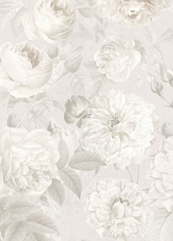 De "Centifolia Muscosa", beter bekend als mosroos, is een echte schoonheid, waarvan de details bijzonder mooi uitkomen op het grijs-witte fotobehang.