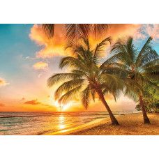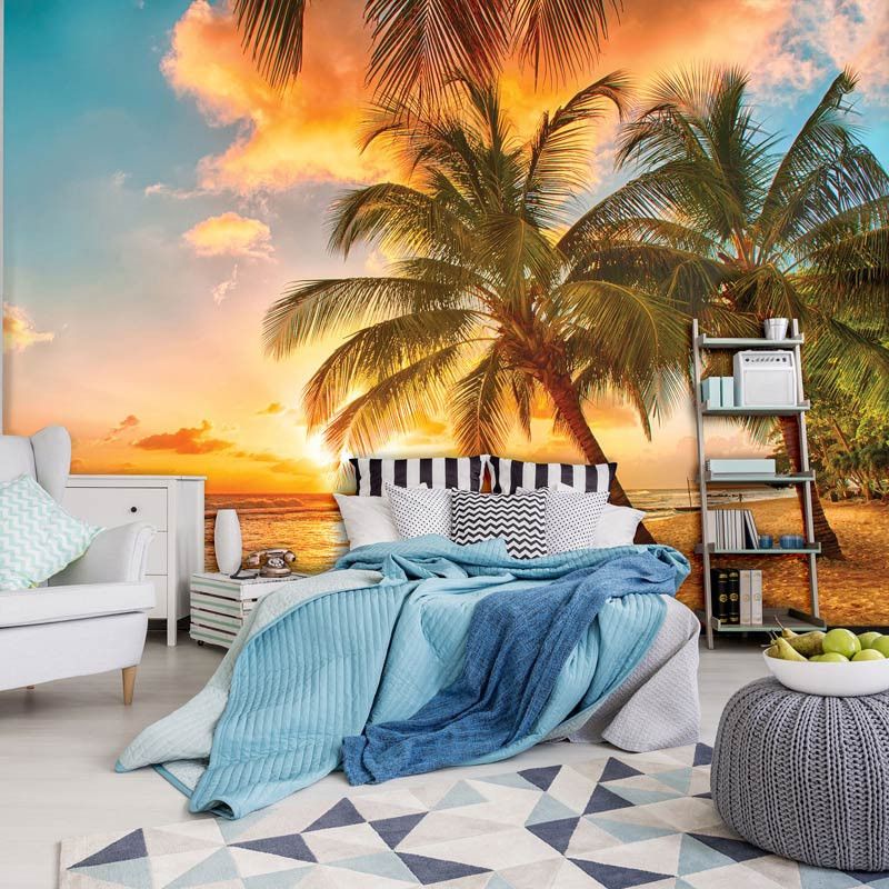 Fotobehang van een zonsondegang aan het hemelse strand met de schitterend palmbomen en de blauwe zee.