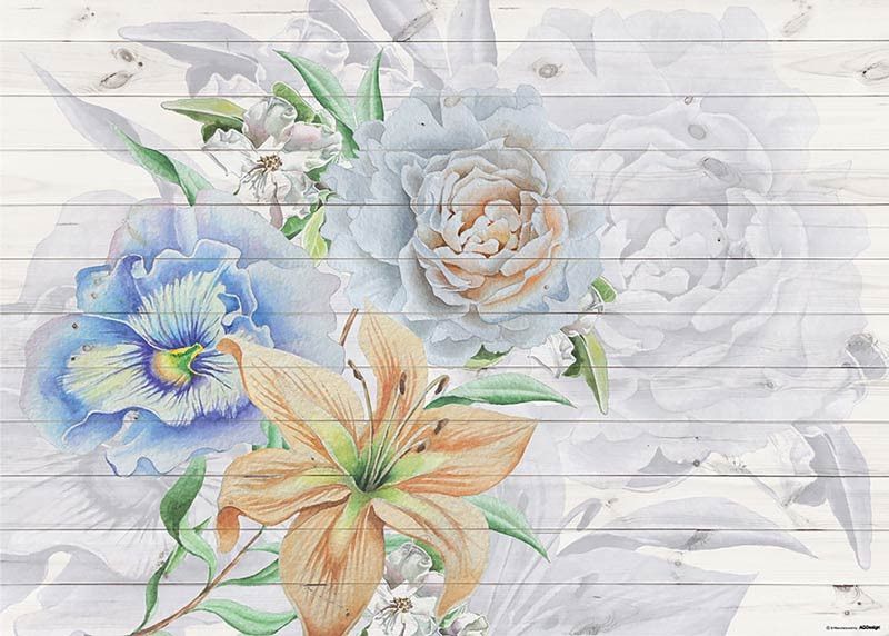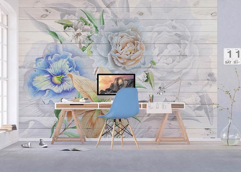 Breng een landelijke charme in je interieur met delicate bloemen op een achtergrond van houten planken. De zachte pasteltinten en de textuur van het hout geven een warme en uitnodigende sfeer.