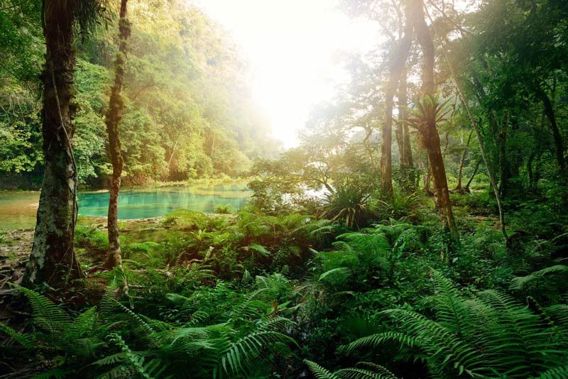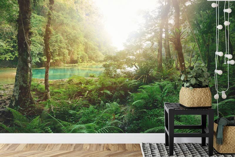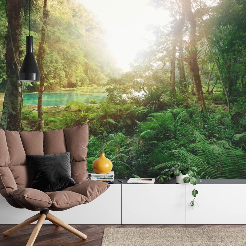 Verlies jezelf in de weelderige pracht van Fotobehang Diep in de Jungle. Laat je meevoeren naar een exotische wereld van weelderig groen, kleurrijke flora en mysterieuze fauna terwijl je diep in de jungle doordringt.