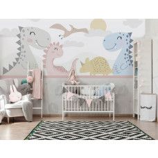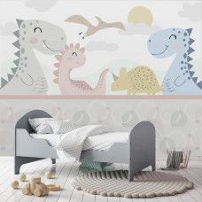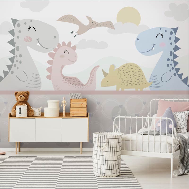 Fotobehang van vrolijke dinosaurussen weergegeven in pastelkleuren.