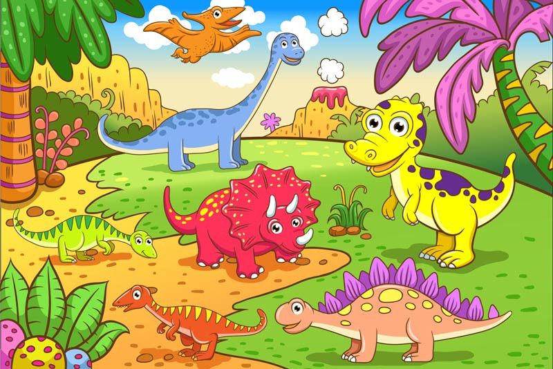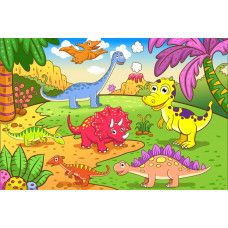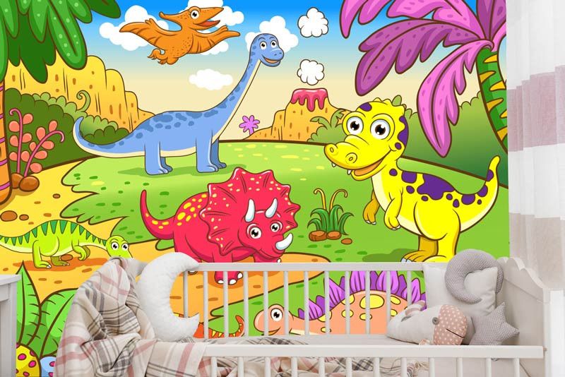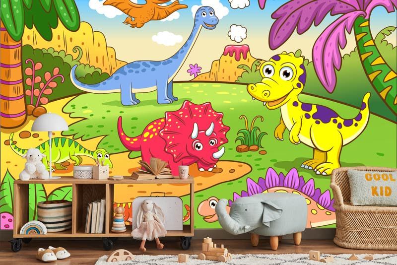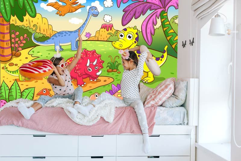 Bestel het fotobehang op maat en laat je kinderen dromen over avonturen tussen de prehistorische reuzen en de vulkaan.