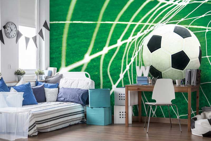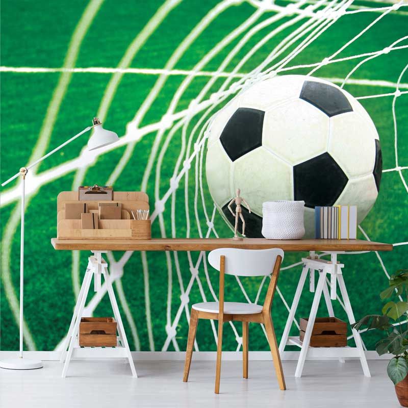 Vlies fotobehang van een voetbal die zojuist in het doel is geschoten. Leuk voor in de kinderkamer, slaapkamer, woonkamer, hal, kantoor of iedere andere ruimte.