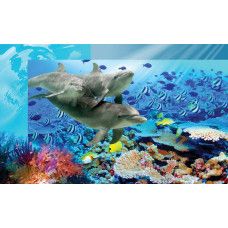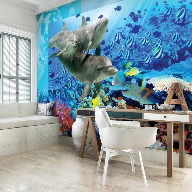 Vlies fotobehang van 3 prachtige dolfijnen, diep in de helderblauwe zee. Staat geweldig in de: kinderkamer, slaapkamer, woonkamer, hal, kantoor of iedere andere ruimte.