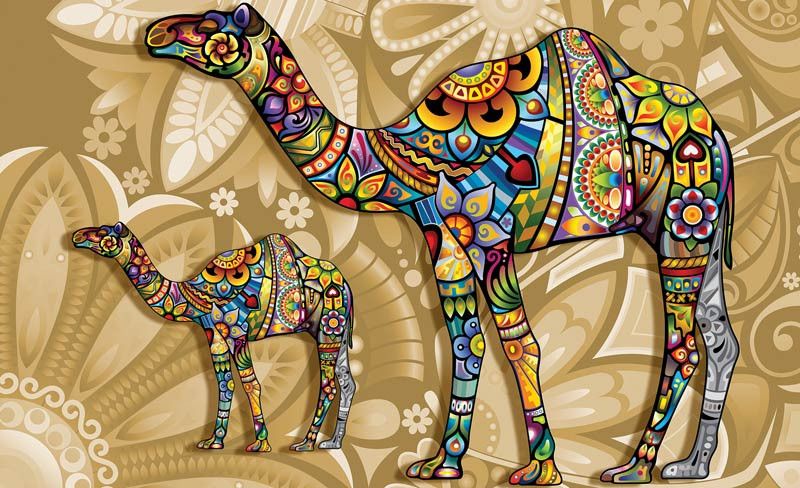 Fotobehang van een prachtig kunstwerk met daarin een sierlijke dromedaris en een aantal bloemen.