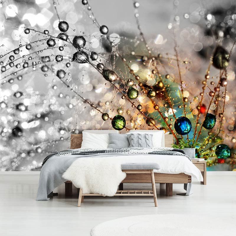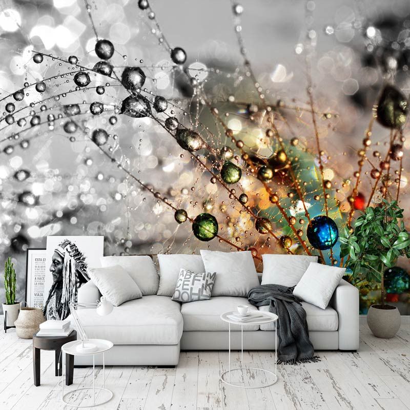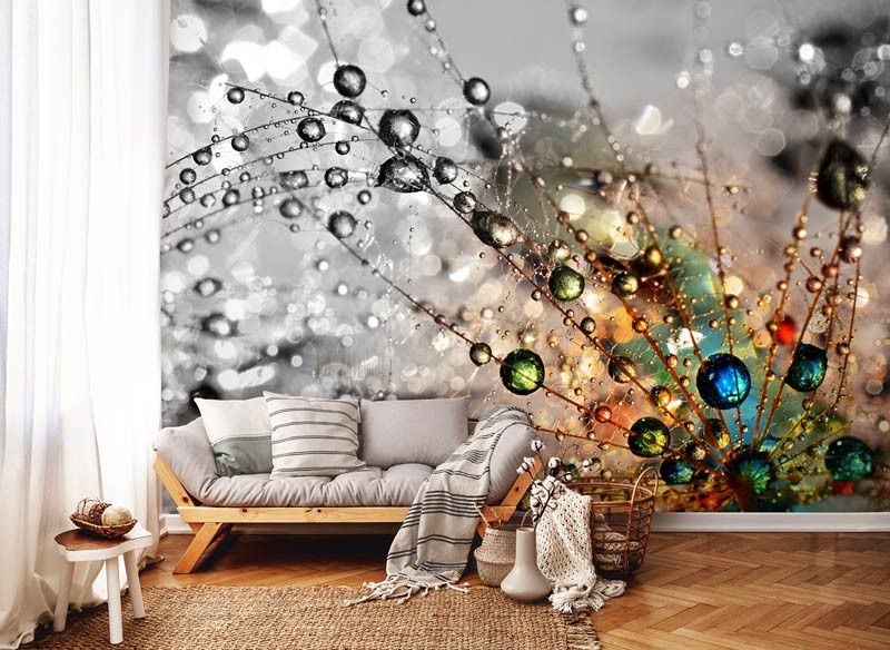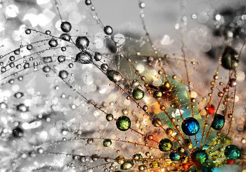 Fotobehang van door het licht gekleurde druppels op een paardenbloem.