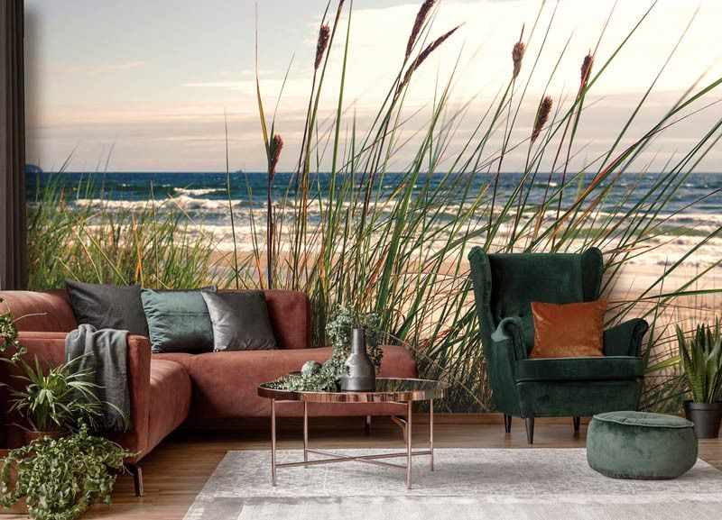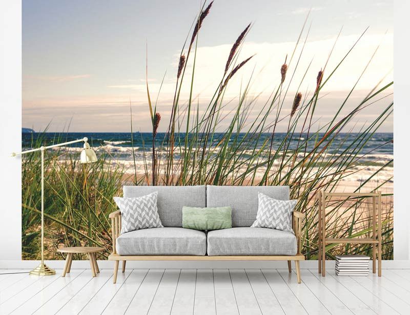 Vliesbehang van het uitzicht tussen de duinen door op het strand en de helderblauwe zee.