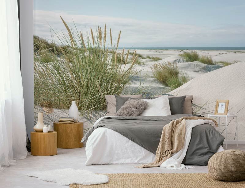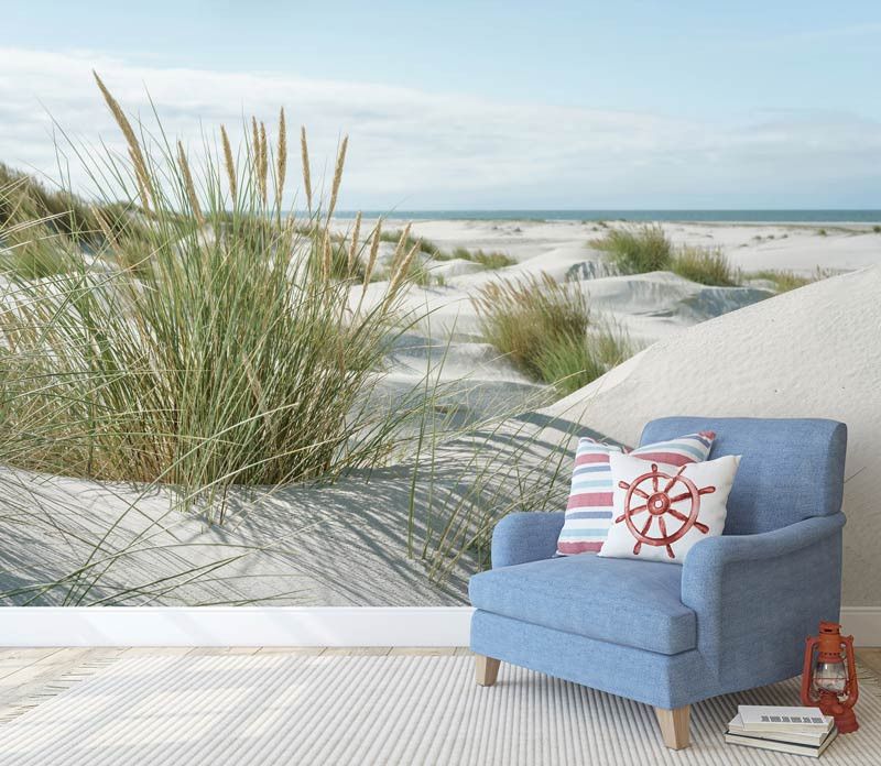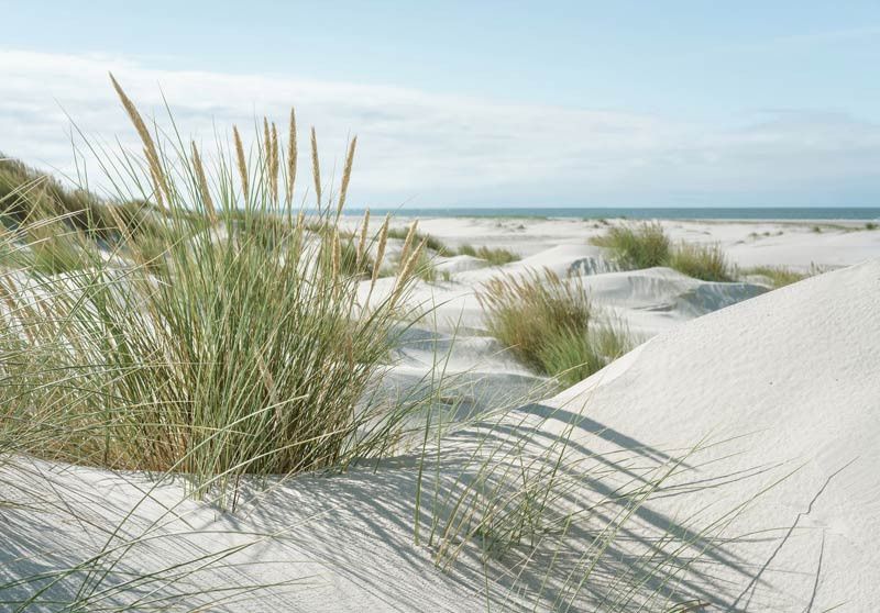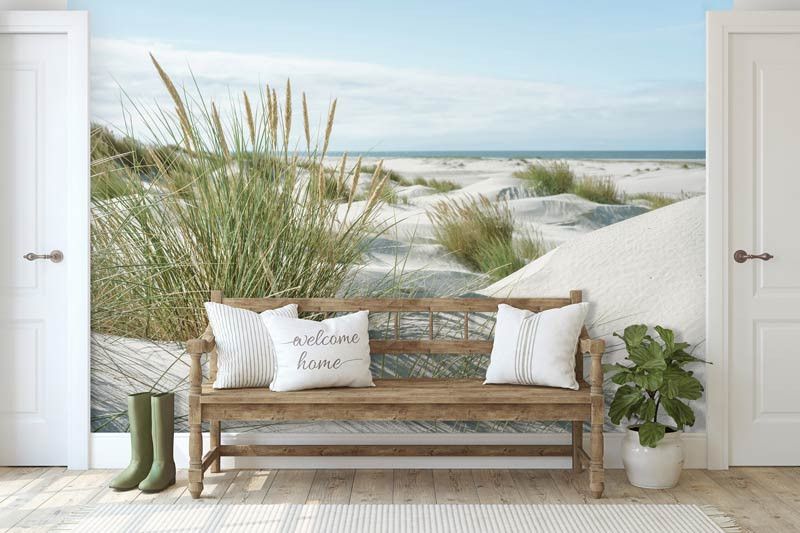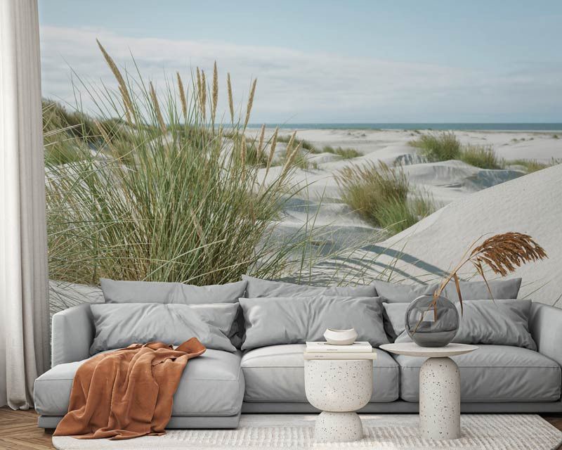 Breng het gevoel van vrijheid en frisse zeelucht naar binnen met dit prachtige fotobehang Duinen aan de Kust. Het zachte witte zand, wuivende helmgras en de oneindige horizon zorgen voor een rustgevende sfeer die elke ruimte groter en lichter doet lijken. Dit serene kustlandschap is perfect voor liefhebbers van de natuur en een ontspannen interieur.