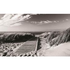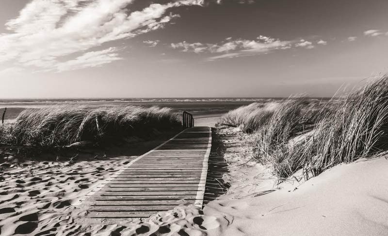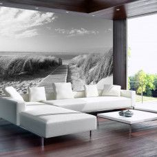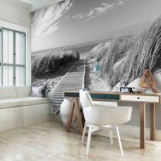 Vlies fotobehang van een voetpad tussen de duinen door richting het strand in het zwart-wit.