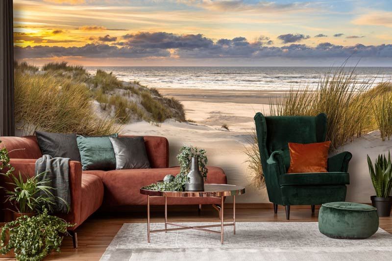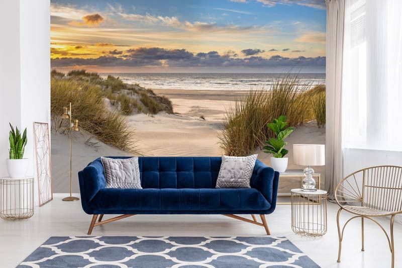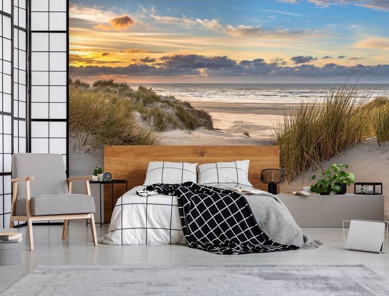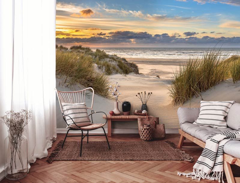 Haal de rust en schoonheid van de kust in huis met ons Fotobehang Duinen bij de Noordzee. Dit prachtige ontwerp toont de duinen bij de Noordzee, met een adembenemende gekleurde lucht van de zonsondergang en een uitgestrekt strand op de achtergrond. De warme kleuren van de ondergaande zon en het natuurlijke landschap zorgen voor een ontspannen en sfeervolle uitstraling, perfect voor elke ruimte.