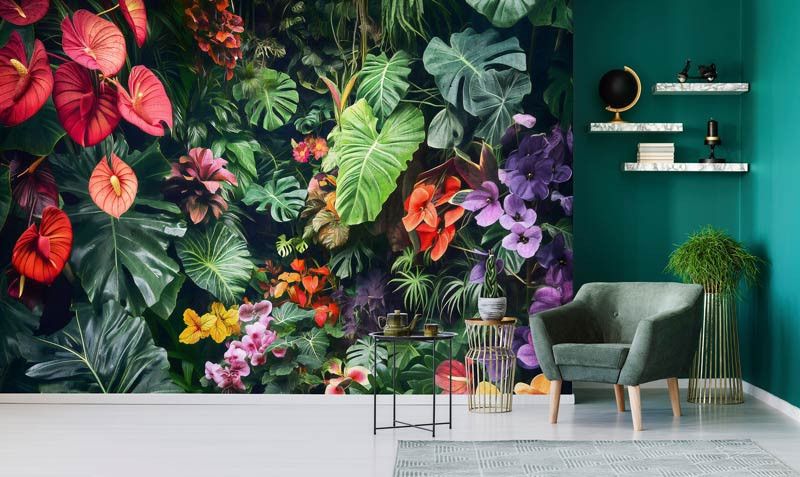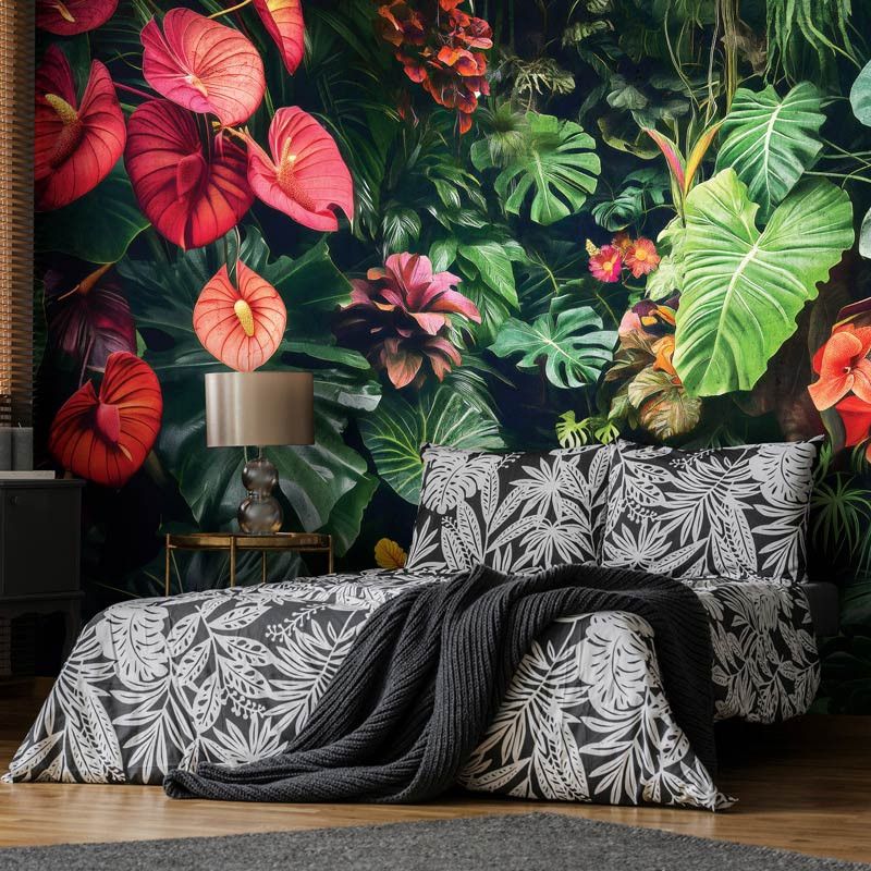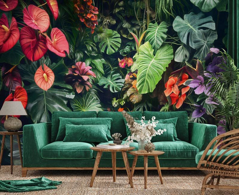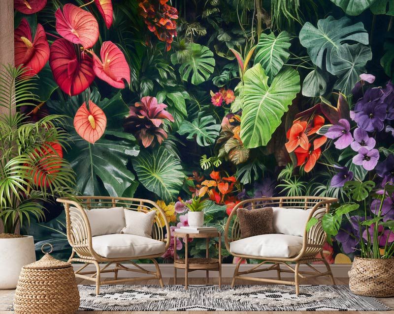 Breng een tropisch paradijs in huis met ons Fotobehang Exotische Jungle Bladeren. Dit prachtige ontwerp toont een weelderige mix van jungleplanten, kleurrijke bloemen en bladeren, die samen een levendig en fris geheel vormen. Het rijke kleurenpalet en de gedetailleerde weergave van de tropische natuur maken dit behang een perfecte keuze voor liefhebbers van exotische interieurs.