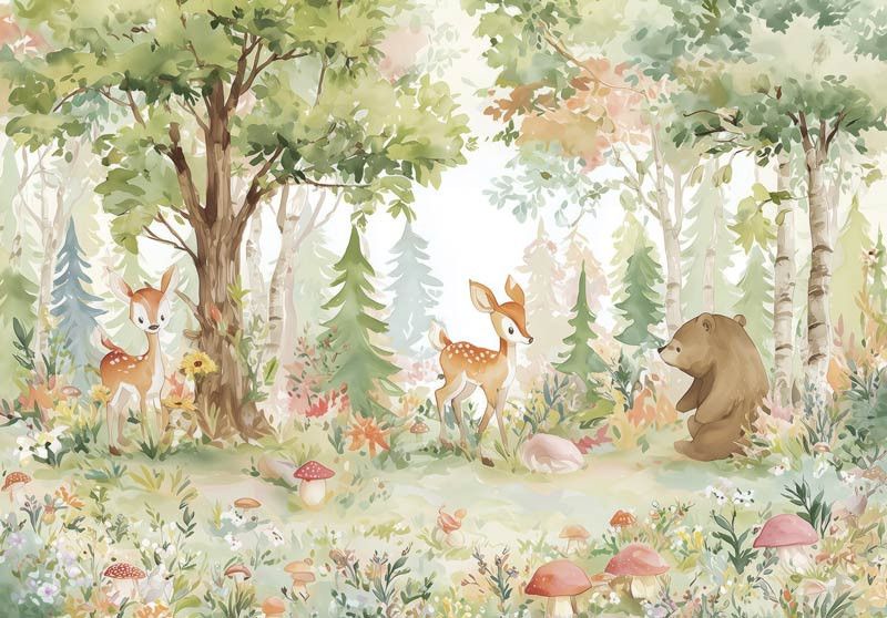 Een charmant boslandschap met speelse hertjes, een vriendelijke beer en kleurrijke details zoals paddenstoelen en bloemen. De zachte tinten en aquarelstijl geven dit ontwerp een warme, fantasievolle uitstraling die kinderen meteen aanspreekt.