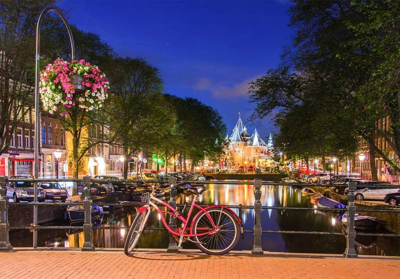 Breng de magie van Amsterdam bij avond in huis met ons fotobehang met een rode fiets op een brug in Amsterdam. Dit sfeervolle ontwerp toont een opvallende rode fiets op een klassiek Amsterdams bruggetje, omringd door de verlichte grachtenpanden en weerspiegelingen in het stille water. De warme verlichting en diepe kleuren van de avond creëren een intieme en authentieke sfeer, perfect voor de woonkamer, slaapkamer of studeerkamer.