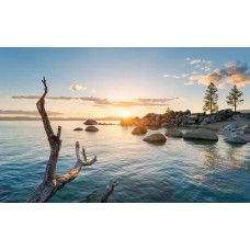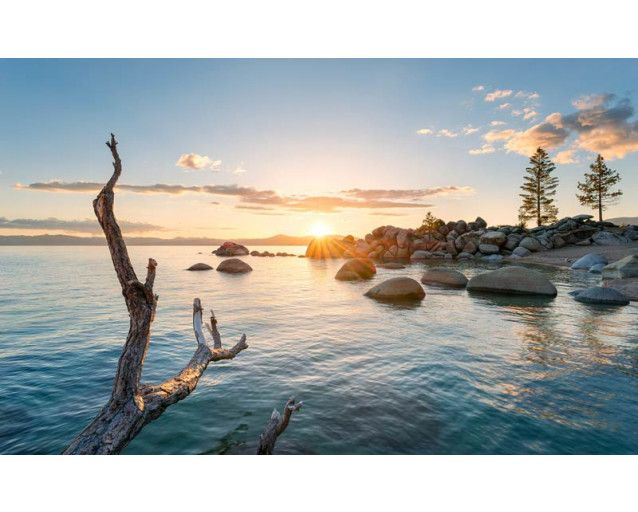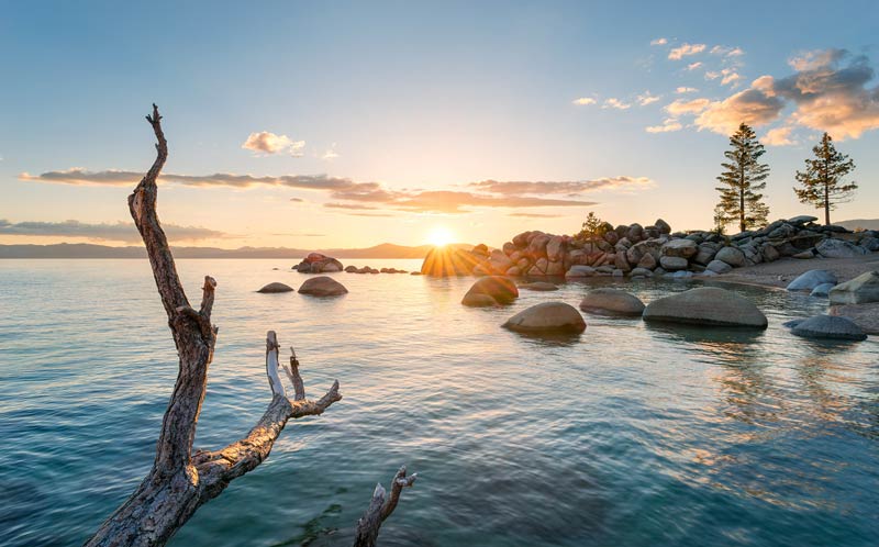 De laatste zonnestralen van de dag baden de oevers van Lake Tahoe in een schilderachtig licht.
