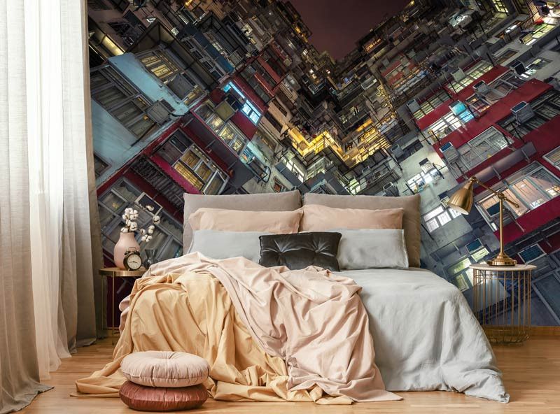 Het fotobehang van het flatgebouw is de perfecte aanvulling op elke ruimte.