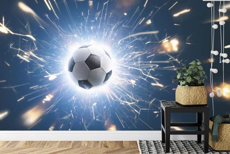 Verrijk je ruimte met Fotobehang Flitsende Voetbal, waar een voetbal schittert te midden van flitsen van energie. Laat de passie voor het spel stralen in een uniek ontworpen interieuraccent.