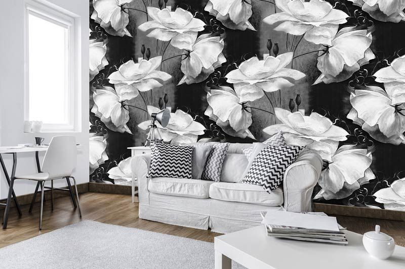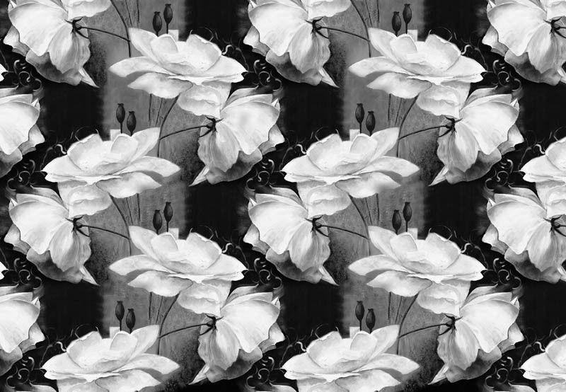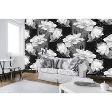 Vlies fotobehang van een abstract, zwart-wit bloemenpatroon, weergegeven in een moderne stijl.