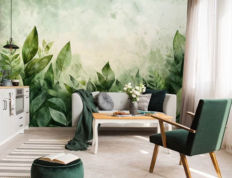 Breng een levendige en frisse sfeer in huis met dit fotobehang van groene bladeren in aquarelstijl. De losse penseelstreken en transparante lagen geven het ontwerp een lichte, natuurlijke uitstraling die perfect past bij een modern of Scandinavisch interieur.