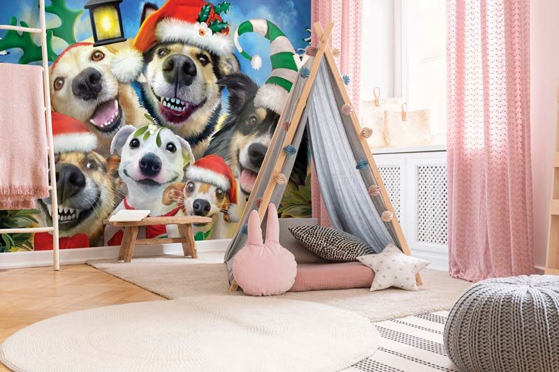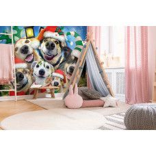 Vlies fotobehang van doldwaze honden, die samen een te gekke foto hebben gemaakt! Een must voor iedere kinderkamer.