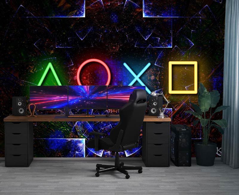 Breng een futurische sfeer in je gamekamer met het Fotobehang Gaming Neon PlayStation Symbolen. Dit opvallende ontwerp toont de bekende PlayStation-symbolen – driehoek, vierkant, kruis en cirkel – in neonverlichting tegen een donkere, zwart met blauwe achtergrond. De lichtgevende accenten geven het behang een high-tech uitstraling die perfect past bij elke moderne gamersruimte.