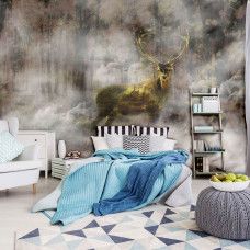 Vlies fotobehang prachtig, goudkleurig hert in een mistig bos.