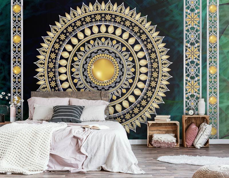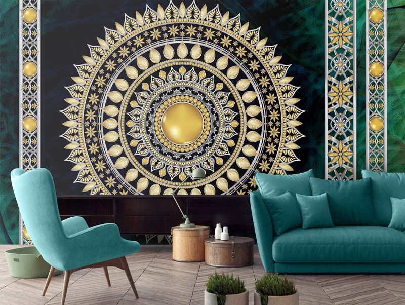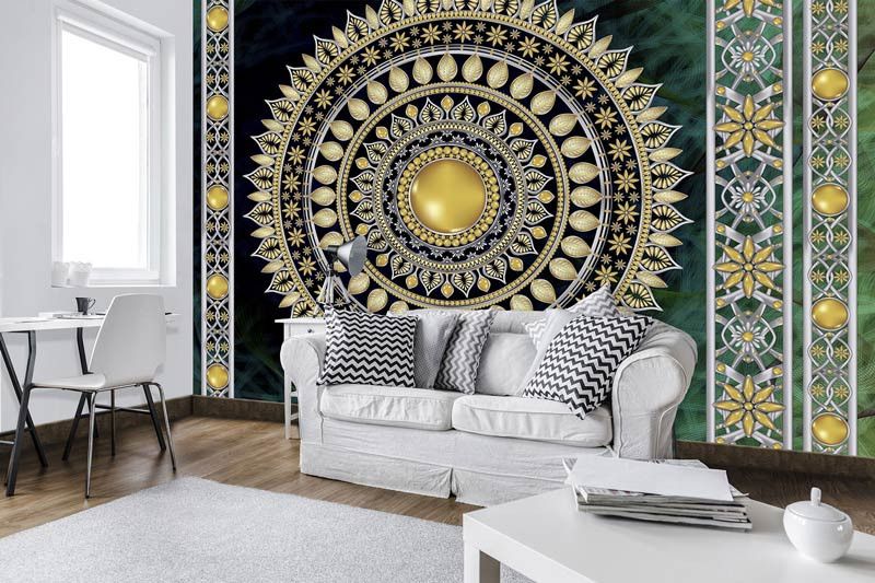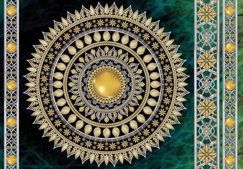 Vlies fotobehang een prachtige, gouden mandala in smaragd.