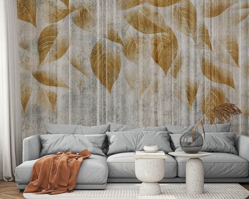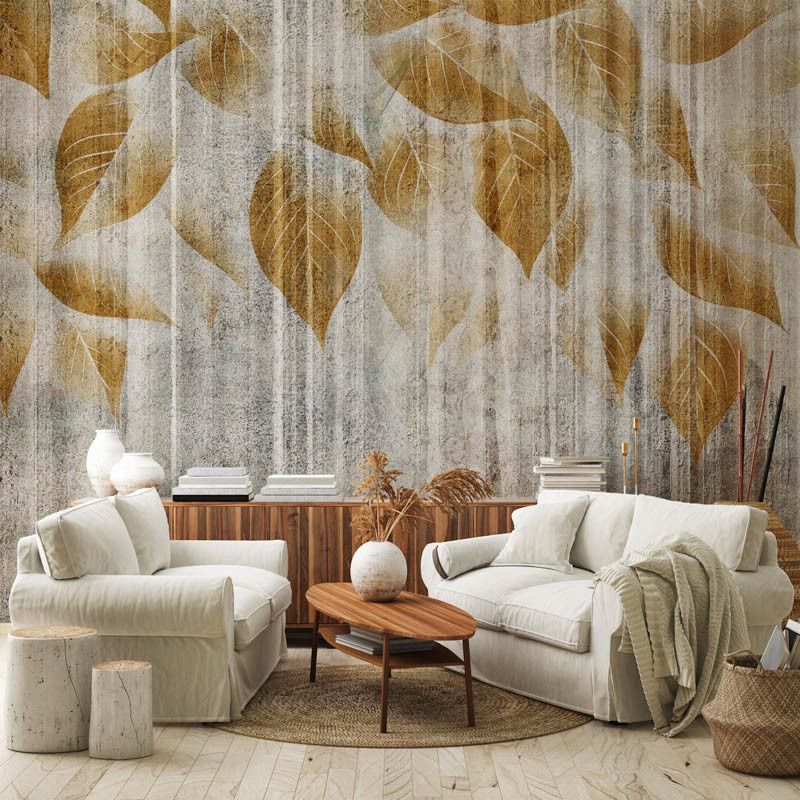 Fotobehang Gouden Bladeren op Ruw Beton