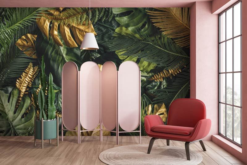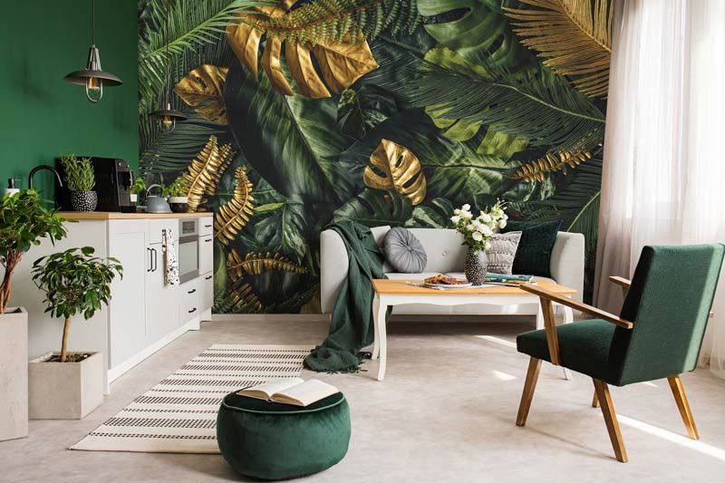 Het fotobehang van de groene en gouden bladeren is een echte eyecatcher en geeft een luxe uitstraling in elke ruimte.
