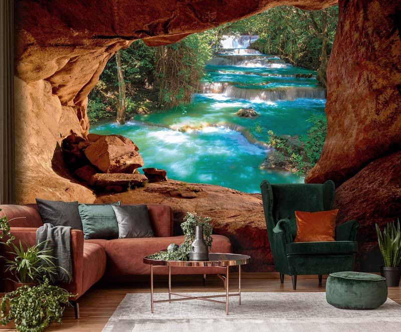 Fotobehang Grot met uitzicht op de Watervallen 3D