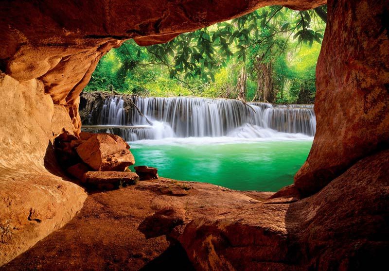 Fotobehang Grot met uitzicht op een Waterval 3D