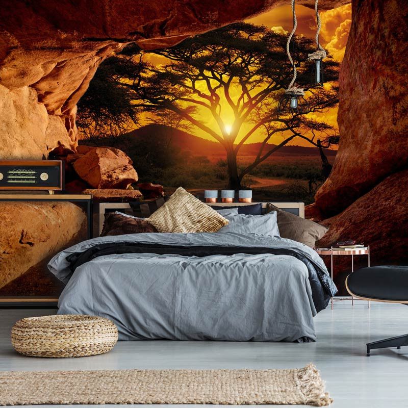 Vlies fotobehang van het uitzicht op een prachtige zonsondergang, vanuit een grot gezien. Het uitzicht vanuit de grot zorgt voor een geweldig, 3D effect.