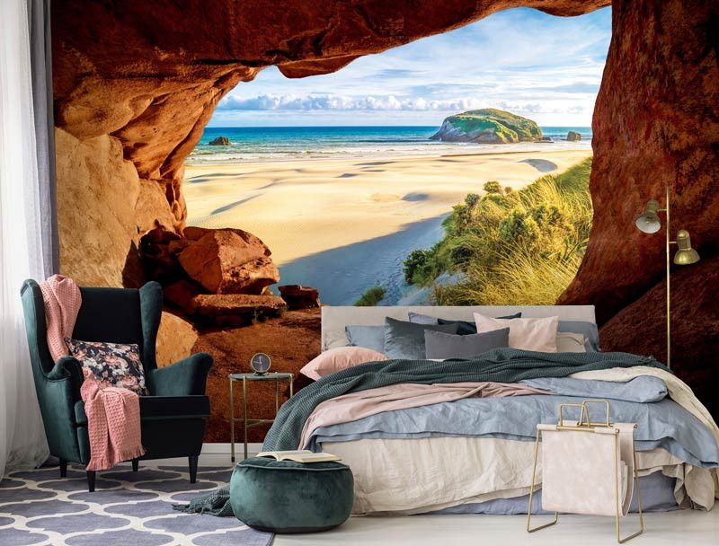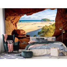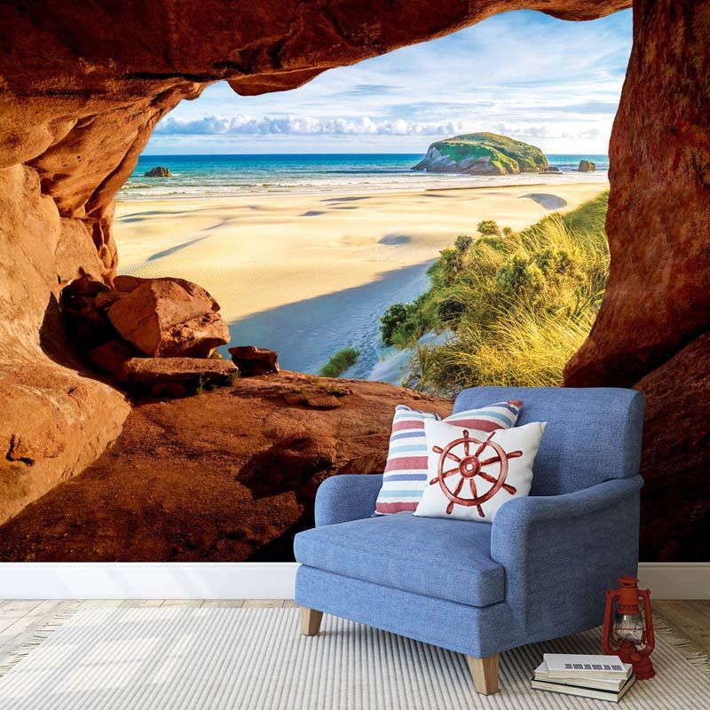 Fotobehang Grot met uitzicht op het Strand 3D.
