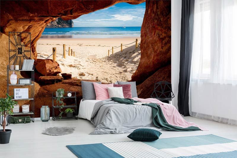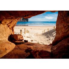 Vlies fotobehang van het uitzicht op het strandpad richting het strand en de helderblauwe zee, vanuit een grot gezien. Het uitzicht vanuit de grot zorgt voor een geweldig, 3D effect.
