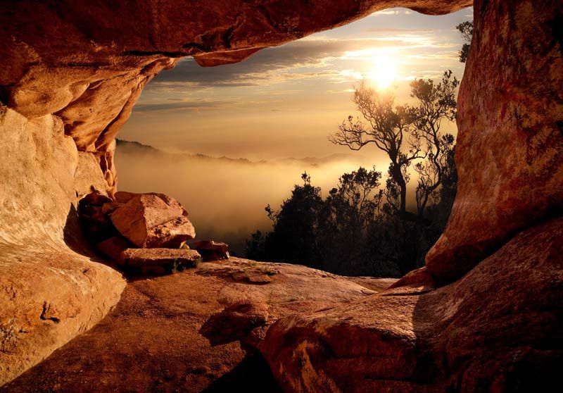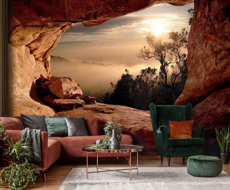 Vlies fotobehang van het uitzicht op laaghangende mist in de boomtoppen van de bomen in het bos, vanuit een grot gezien. Het uitzicht vanuit de grot zorgt voor een geweldig, 3D effect.