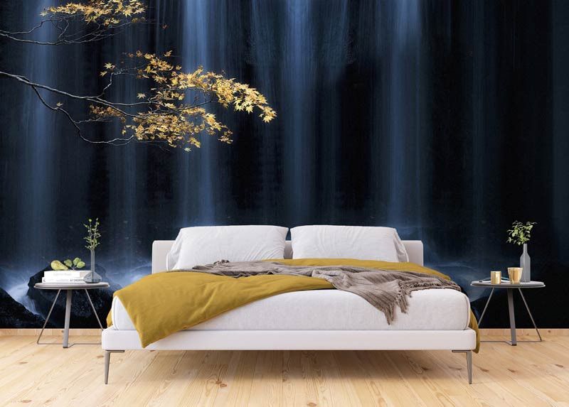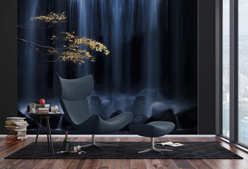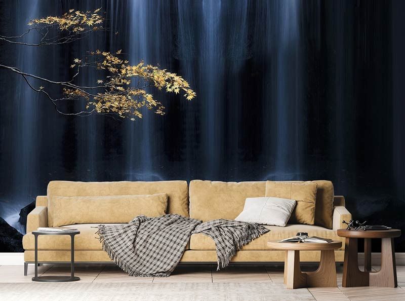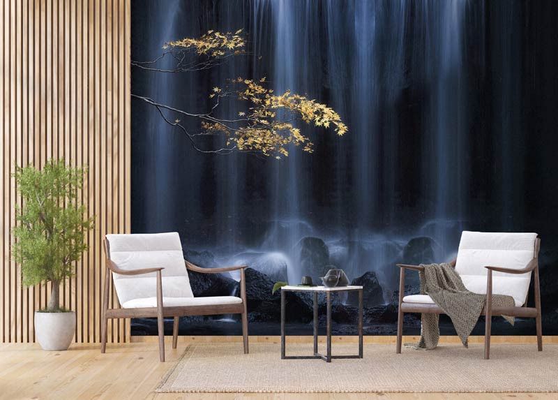 Voel de levendige kleuren van de herfst met dit fotobehang van een herfsttak bij een stromende waterval. De warme tinten van de bladeren en de zachte beweging van het water creëren een dynamische en rustgevende sfeer die elke kamer een natuurlijke uitstraling geeft.