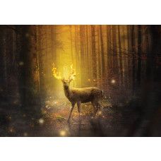 Fotobehang van een sprookjesachtige, zonnig bos met daarin een schitterend hert met een brandende gewei .