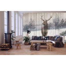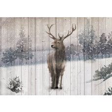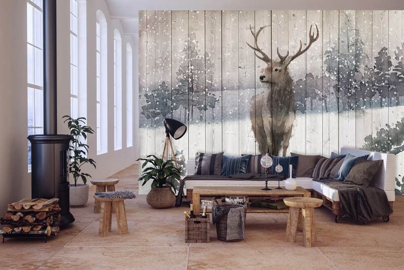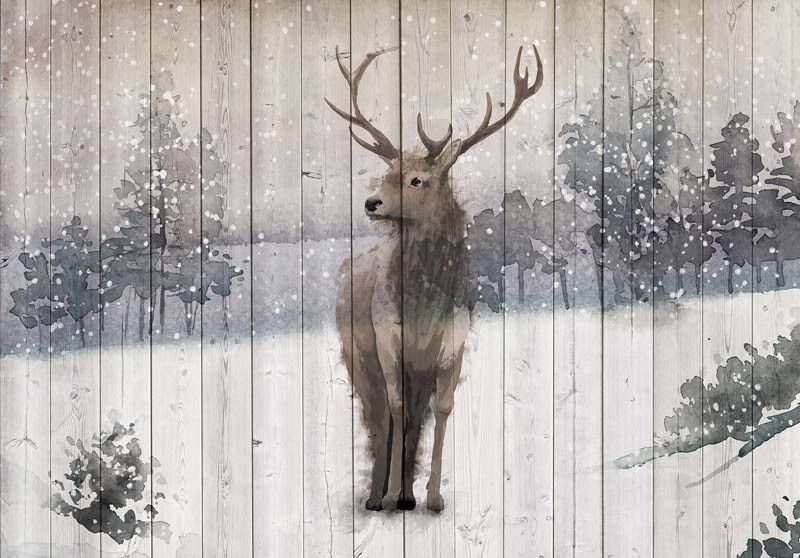 Fotobehang van een hert in het schitterende winterbos, weergegeven op houten planken.