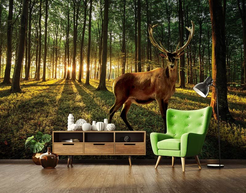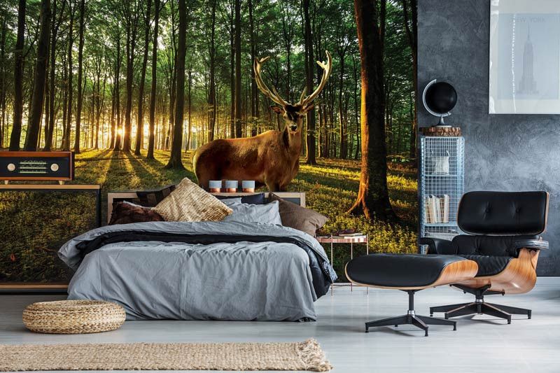 Het fotobehang met het hert in het bos is een unieke aanvulling op elke ruimte.