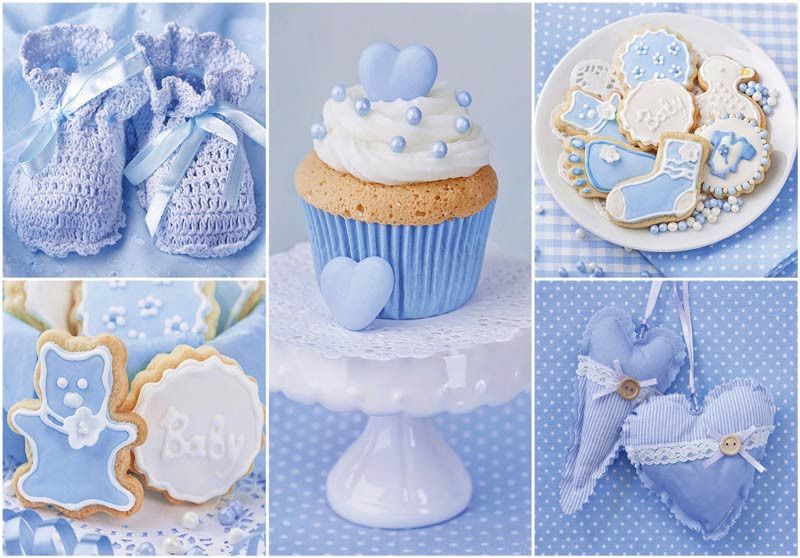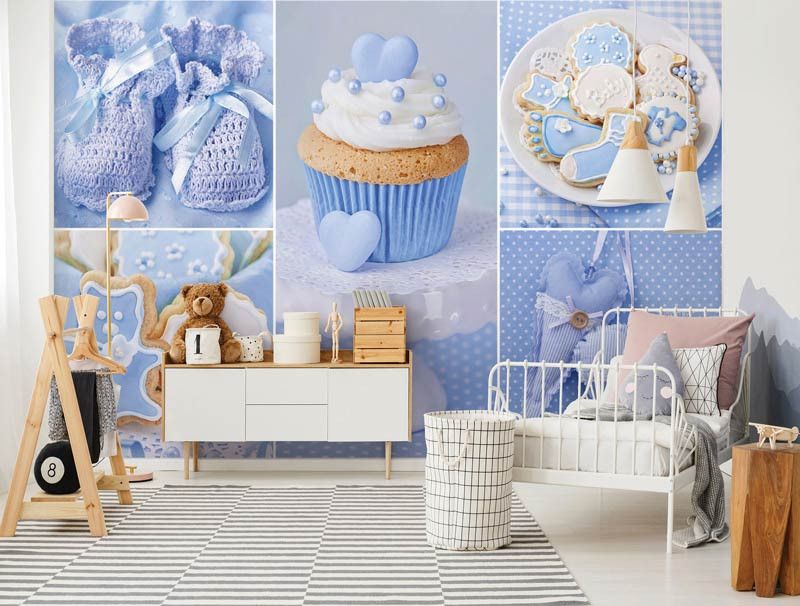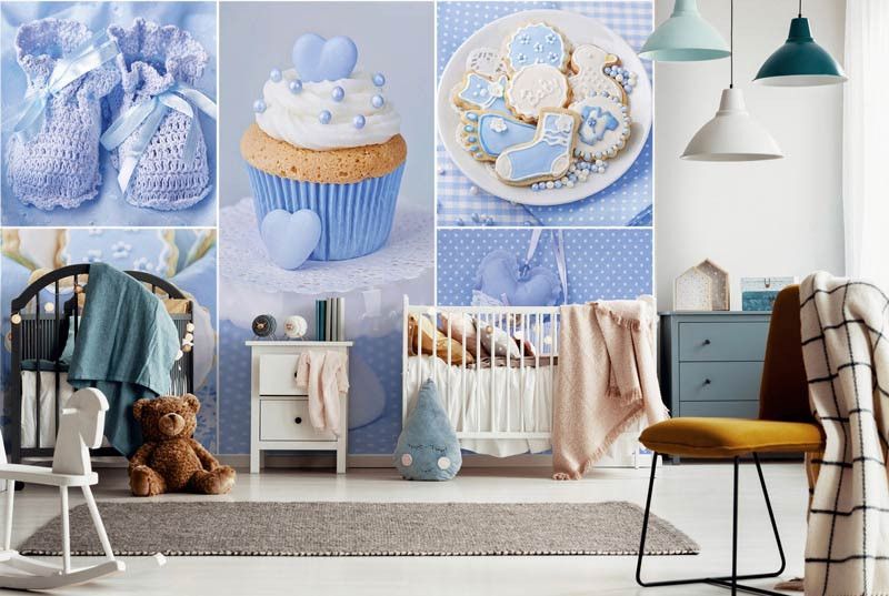Vlies fotobehang van een collage in het blauw, met alles wat te maken heeft bij de aankondiging van je baby.