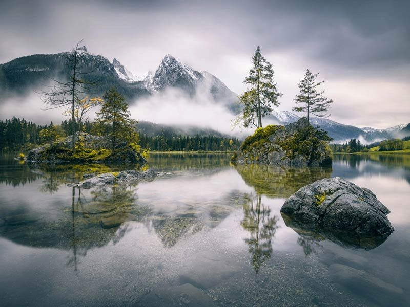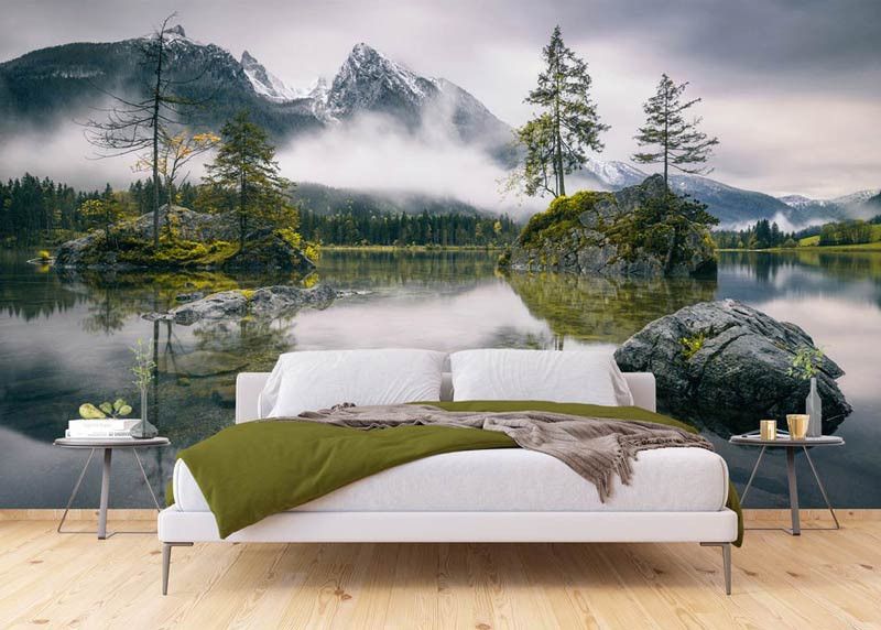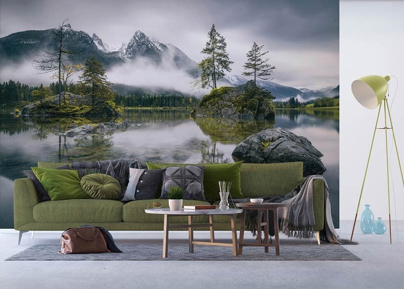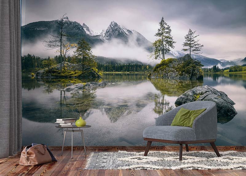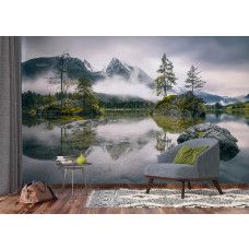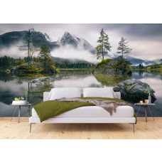 Geniet van het indrukwekkende landschap van de Hintersee met dit fotobehang. De levendige groenen, blauwen en reflecties van bergen in het water brengen een verfrissende en kalmerende sfeer in elke ruimte.