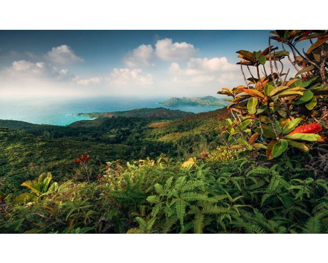 Net als het Hof van Eden strekt de tropische vegetatie zich uit over het Seychellen-eiland Praslin tot aan de turkooisblauwe baai.