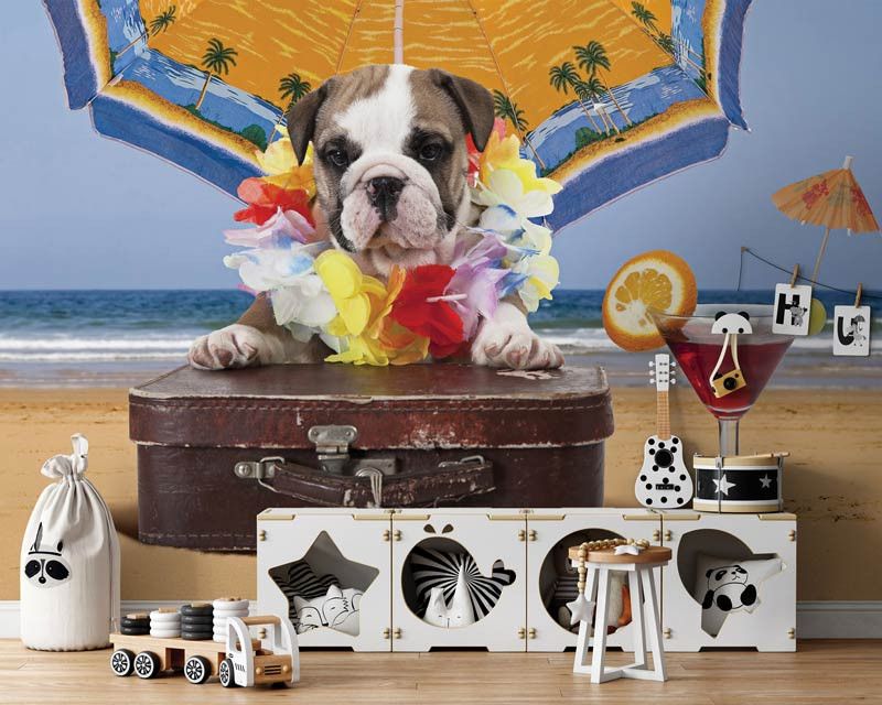 Vlies fotobehang van een te gekke, feestende hond op het strand!